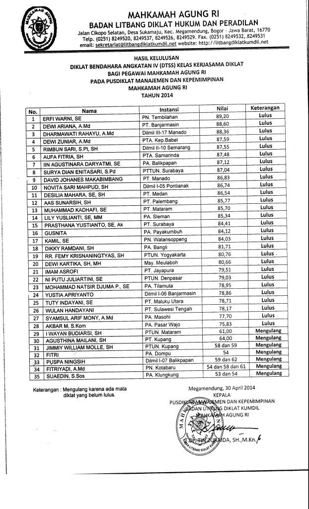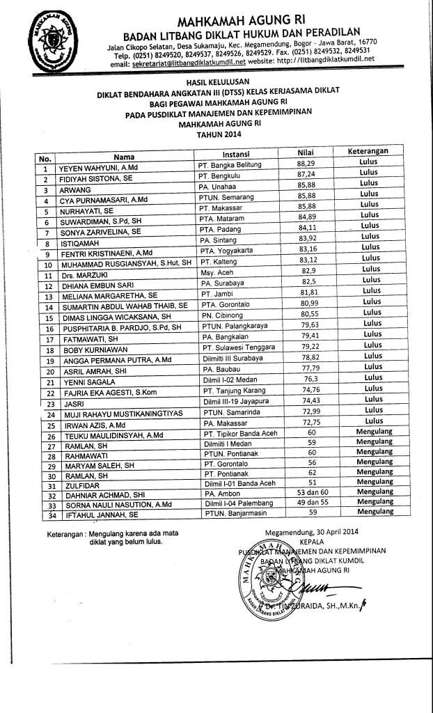 Hasil Kelulusan Diklat Bendahara Angkatan III - IV (DTSS) 2014